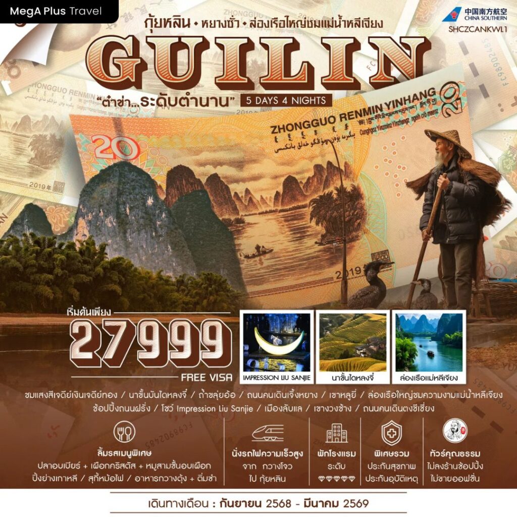 ชมธรรมชาติอันยิ่งใหญ่ของกุ้ยหลิน ล่องเรือแม่น้ำหลีเจียงชมฉากหลังแบงค์ 20 หยวน นั่งกระเช้าชมวิวสุดอลังการ และสัมผัสเสน่ห์เมืองโบราณที่เต็มไปด้วยศิลปวัฒนธรรม พร้อมชมการแสดงสุดตระการตา IMPRESSION LIU SANJIE 🌟